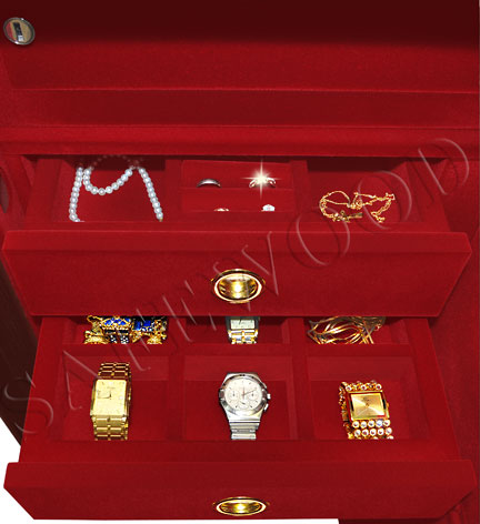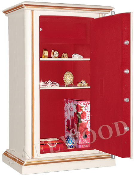 Может использоваться как ювелирный сейф. Для хранения ювелирных изделий, украшений и ценностей сейф дополнительно комплектуется выдвижными или съёмными флокированными лотками.