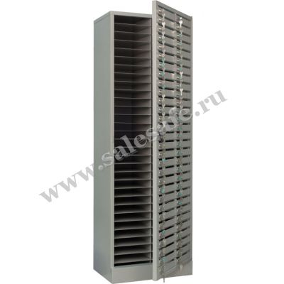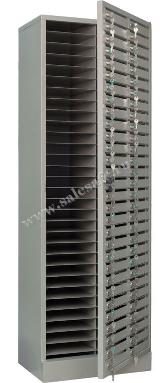 Шкаф с кассовыми ячейками, каждая из которых снабжена своим ключом, удобен для хранения и передачи корреспонденции, документации абонентам в почтовых отделениях, банках, гостиницах и подобных предприятиях.